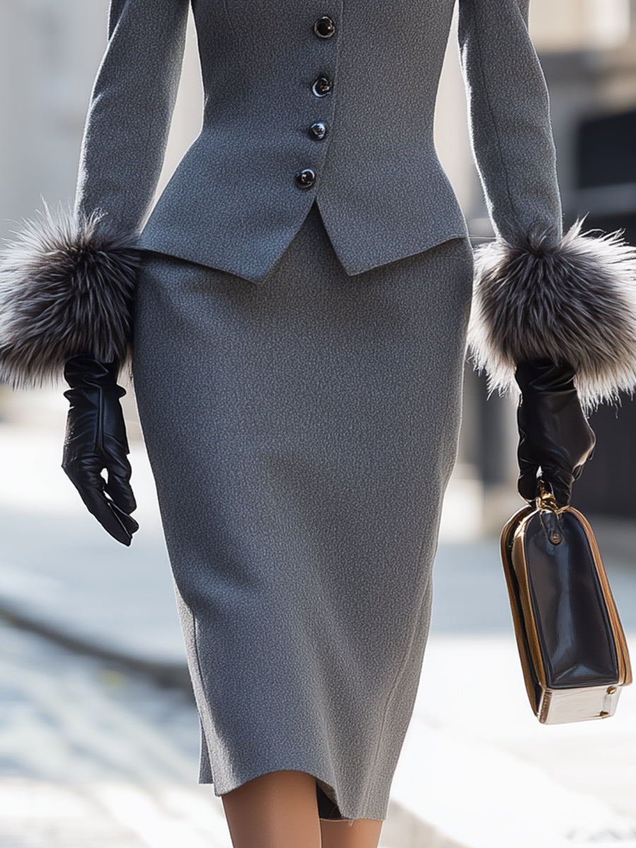 Mooyius återuppfinner klassisk skrädderi med en vinterklar touch i den grå ullkostymen med fuskpälsdetaljer. Denna strukturerade ensemble är tillverkad av premiumulltyg och framhäver en åtsittande jacka prydd med plyschiga fuskpälskanter på kragen och ärmsluten, vilket ger både värme och extra charm. Den eleganta knäppta framsidan och den skulpterade midjan betonar precisionsskräddarkonsten och erbjuder en smickrande passform som sömlöst övergår från kontor till kväll.