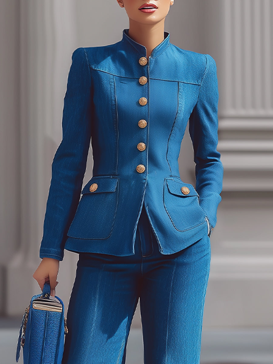 Mooyius presenterar denimkostymen, utformad för att framhäva och accentuera din figur. Med en figurnära jacka med ståkrage, dekorativa knappar framtill och fickor med lock, tillsammans med vida byxor, förenar denna kostym tidlös elegans med modern stil. Den skräddarsydda designen och de långa ärmarna ger en känsla av förfining, vilket gör den till ett idealiskt val för både professionella sammanhang och eleganta sociala sammankomster.