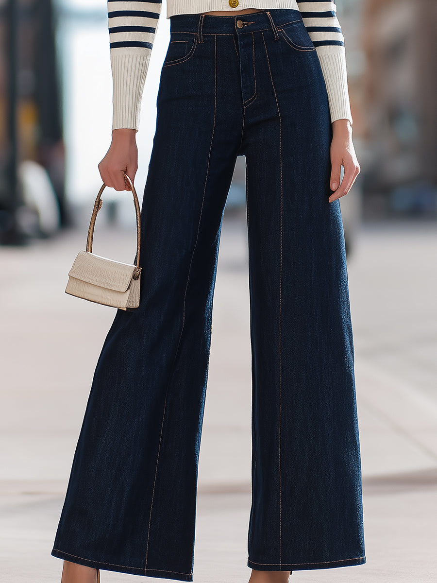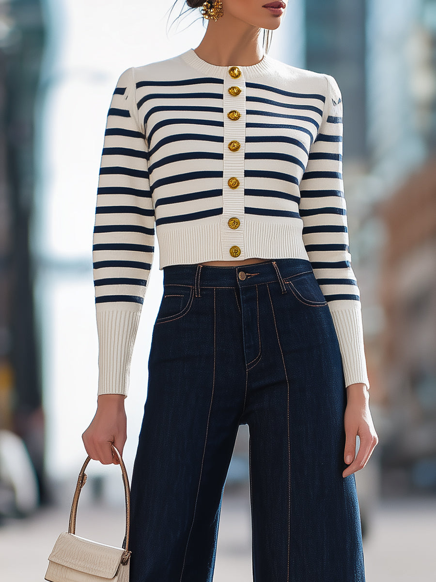 Mooyius presenterar det snygga setet med marinblå randiga, beskurna koftan och mörka denimjeans med vida ben, med ett klassiskt randigt mönster på koftan med guldfärgade knappar, i kombination med mörka denimjeans med hög midja och vida ben. Kombinationen utstrålar en avslappnad men ändå elegant charm, där den beskurna silhuetten och designen med vida ben ger en touch av retrokänsla – vilket gör det till det perfekta valet för helgutflykter och vardagskläder i stan.