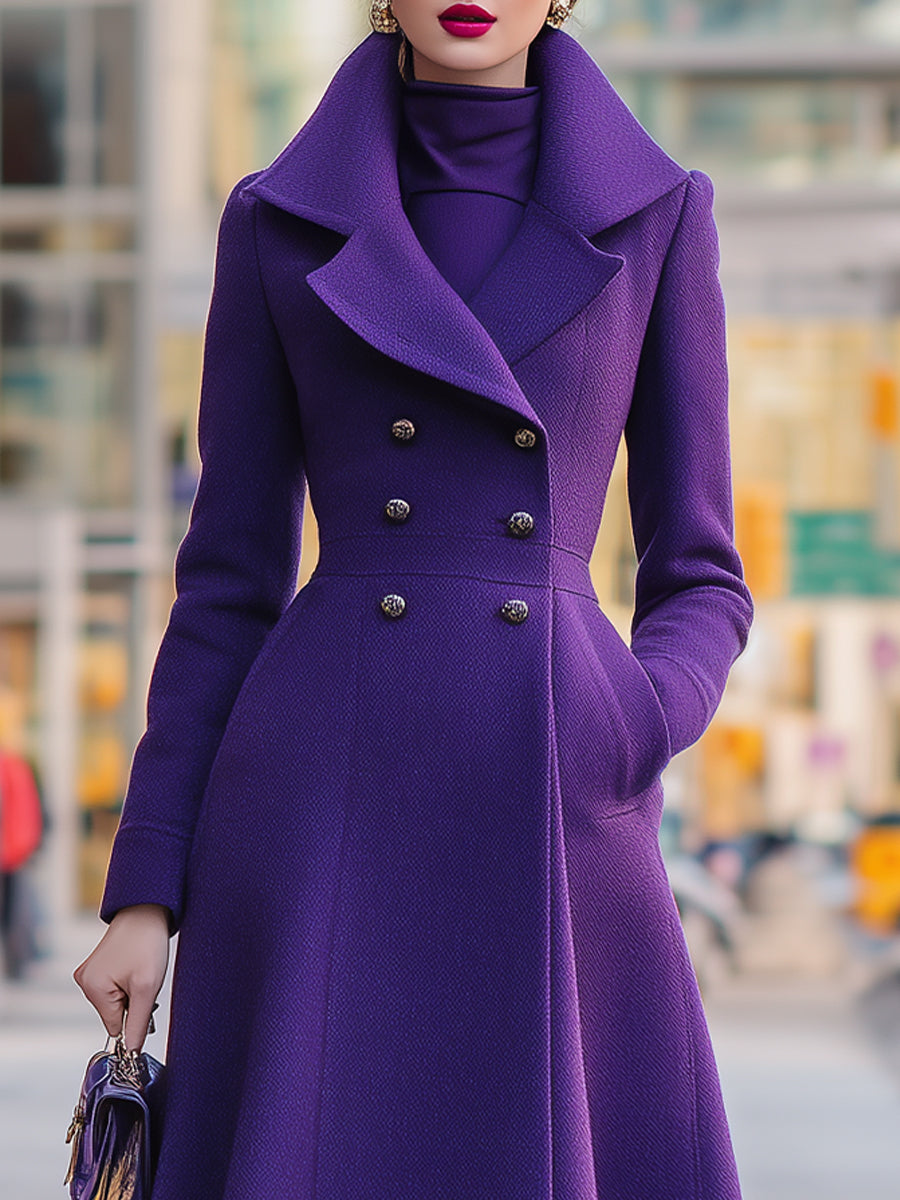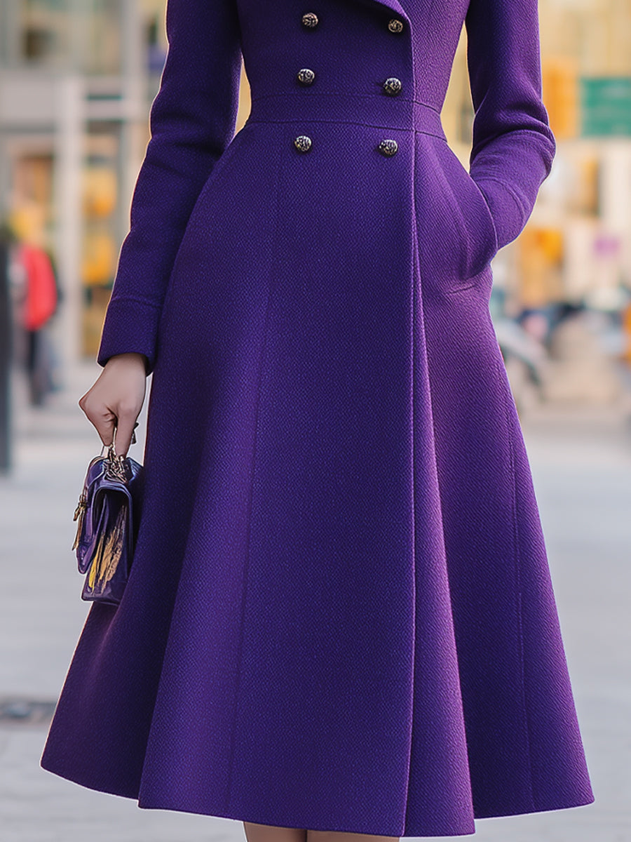 Den utsvängda midilängden ger en känsla av sofistikering och dramatik, vilket gör den till ett iögonfallande plagg i vilken ensemble som helst. Ullblandningen garanterar värme utan att kompromissa med stilen, medan den slående lila nyansen enkelt lyfter både avslappnade och formella looks. Oavsett om den kombineras med klackar och en matchande kuvertväska för ett glamoröst evenemang eller bärs över vardagskläder för en elegant stadspromenad, kombinerar denna kappa komfort och högmodern dragningskraft.