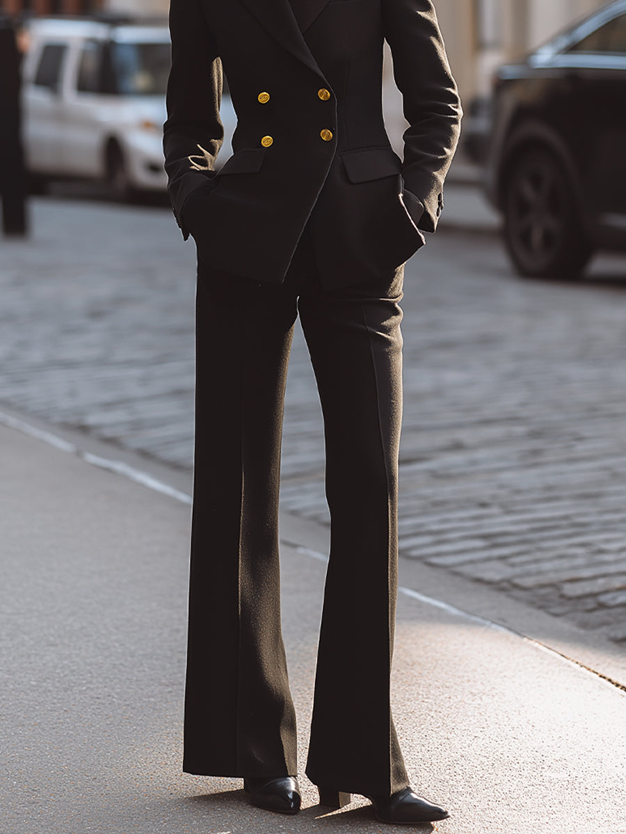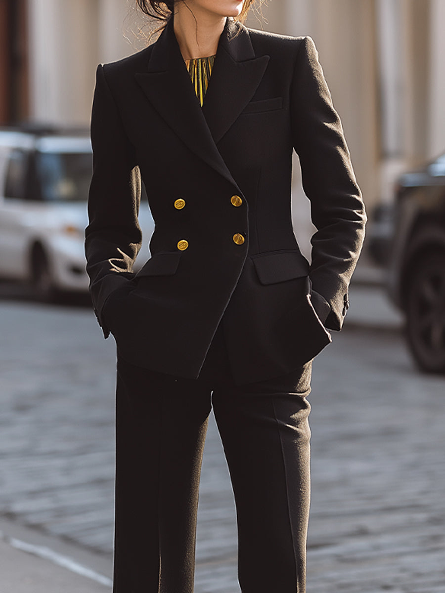 Mooyius presenterar en kraftfull och elegant ensemble som blandar klassisk skrädderi med modern sofistikering. Denna svarta dubbelknäppta kavaj har en skarp, strukturerad design med guldfärgade knappar, perfekt i kombination med högmidjade, vida byxor. Den skarpa silhuetten utstrålar självförtroende och elegans, vilket gör den till ett oumbärligt plagg i den moderna kvinnans garderob.