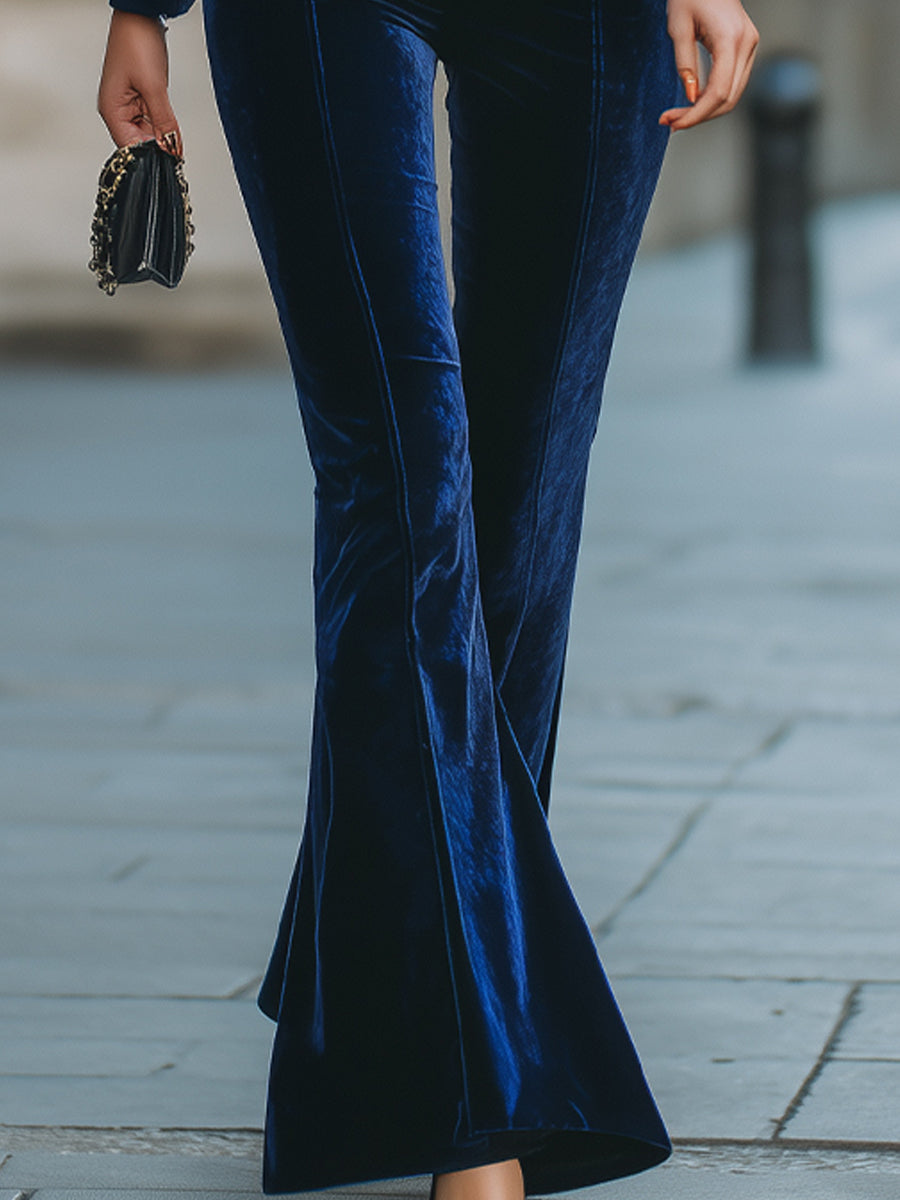 Mooyius presenterar det kungligt blåa sammetskostymsetet. Med en skräddarsydd dubbelknäppt kavaj med guldfärgade knappar och matchande högmidjade utsvängda byxor, förenar detta set vintagecharm och modern elegans. Perfekt för kvällsevenemang, snygga arbetsdagar eller för att sticka ut på formella sammankomster.