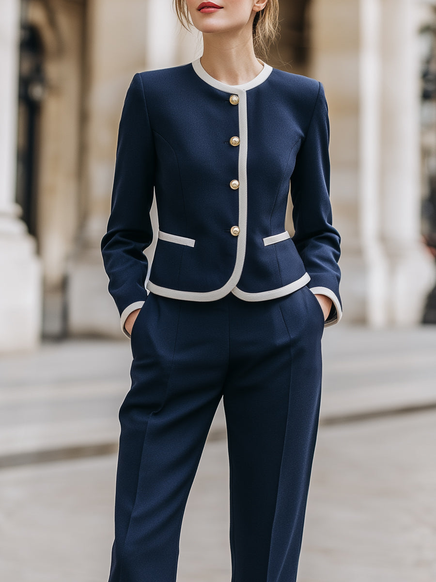 - Design: Figurnära kavaj med elfenbensfärgade kontrastpipingdetaljer