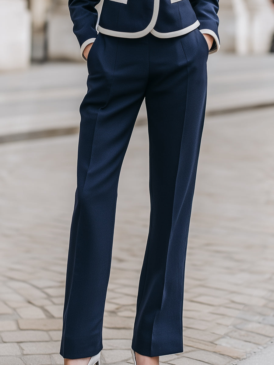 Mooyius presenterar ett elegant och nödvändigt plagg för yrkesverksamma kvinnor som värdesätter sofistikering och precisionsskräddarkonst. Detta marinblå tvådelade set med en skräddarsydd kavaj och raka byxor skapar en perfekt balans mellan modern elegans och tidlös funktionalitet.