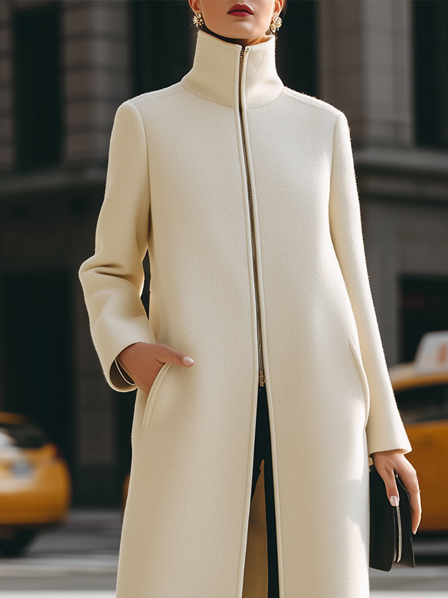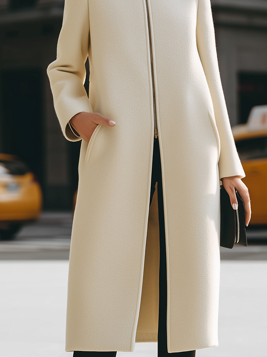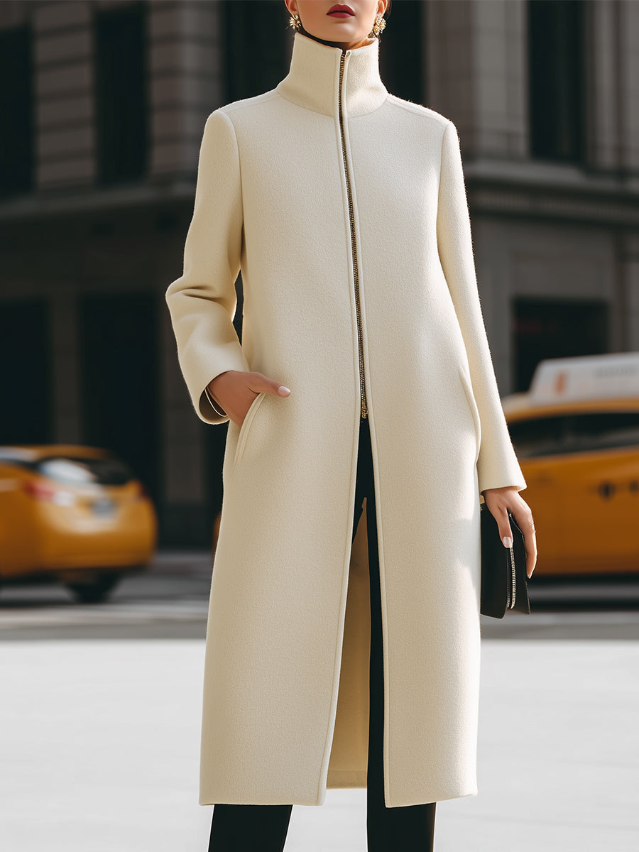 Mooyius presents the cream maxi coat is crafted to flatter and define your silhouette. Featuring a sleek high neck, a central zip closure, and a long, flowing silhouette, this coat blends minimalist elegance with modern allure. The clean lines and structured design add a touch of sophistication, making it a perfect choice for both formal occasions and chic everyday wear.