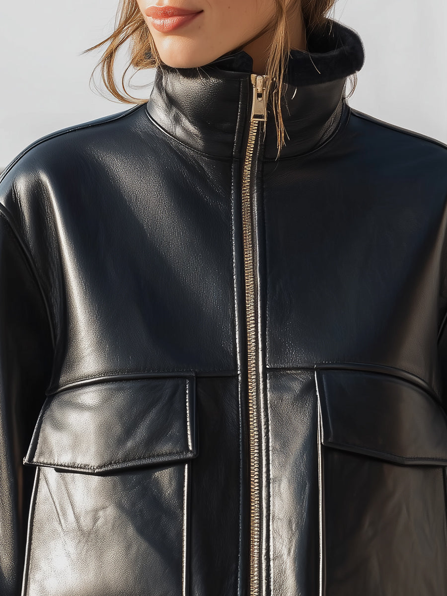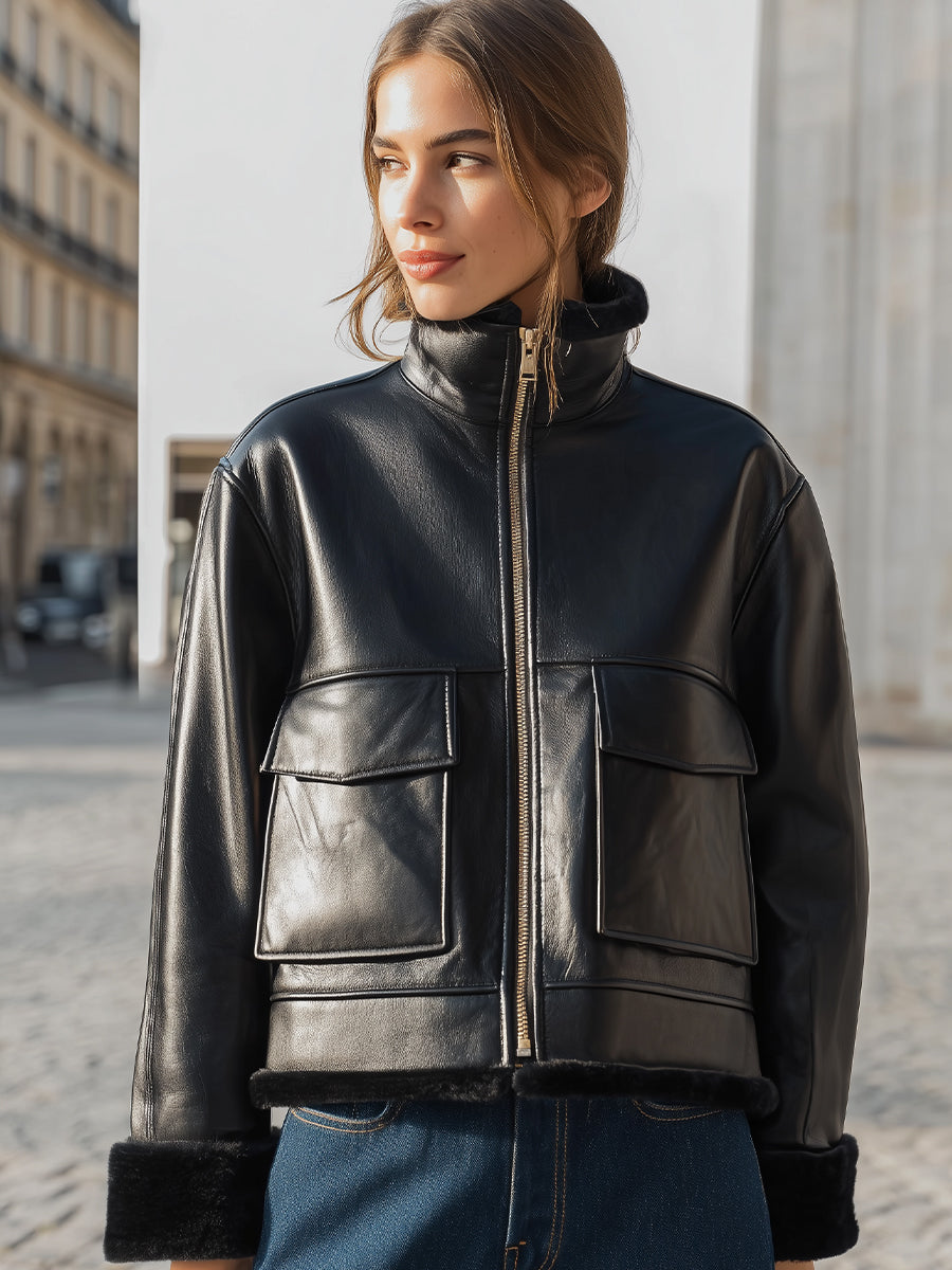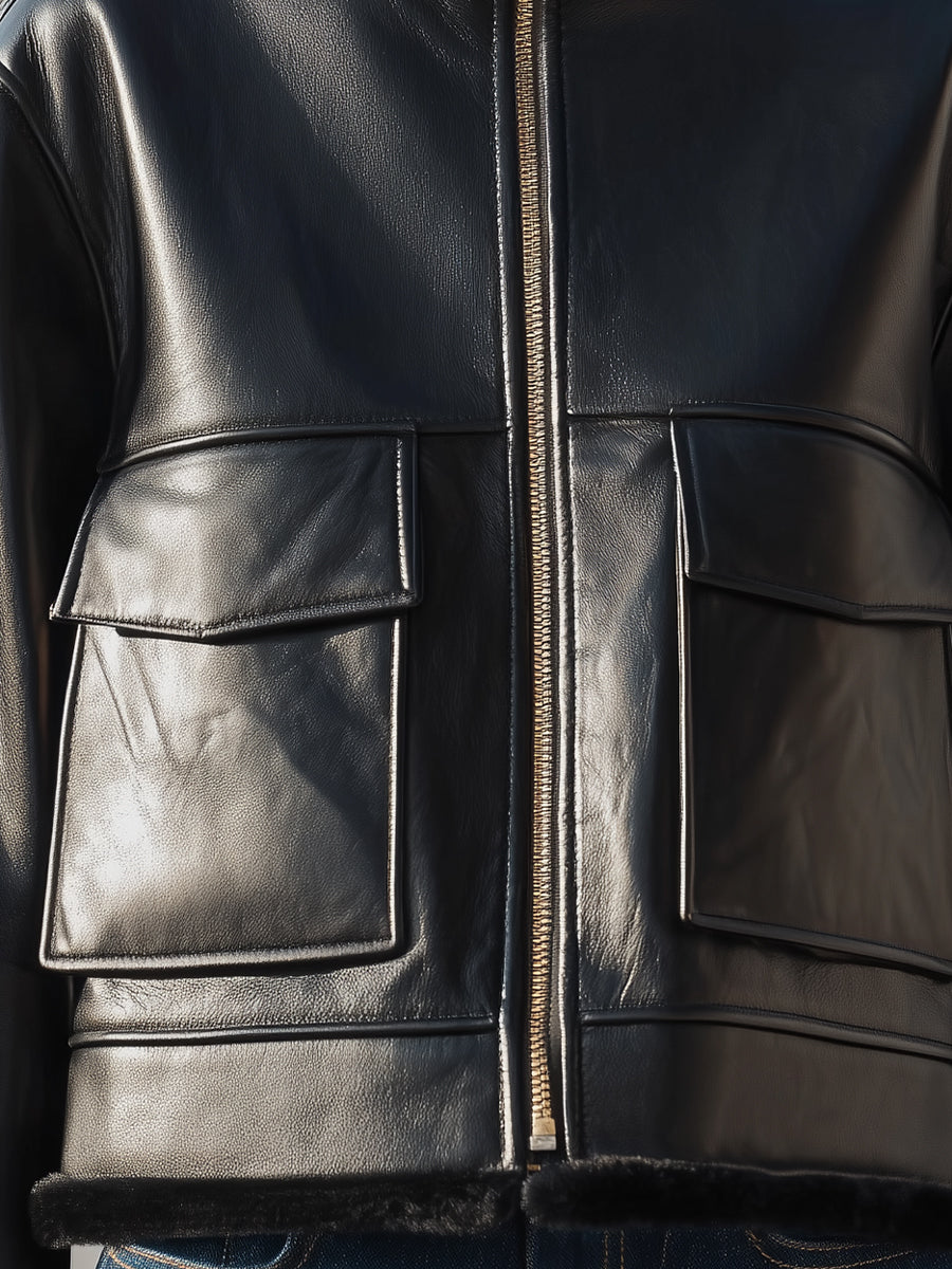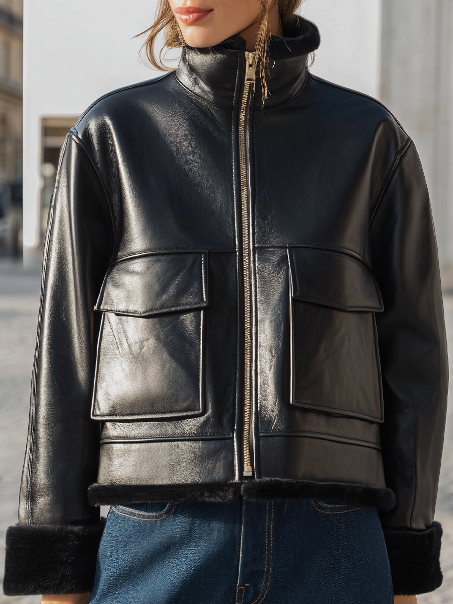 Expertly crafted from faux leather with shearling lining, this jacket offers a trendy look with comfortable warmth. The cropped silhouette and flap pockets elevate the design, making it a versatile piece. Pair it with jeans and boots for a casual, edgy ensemble.